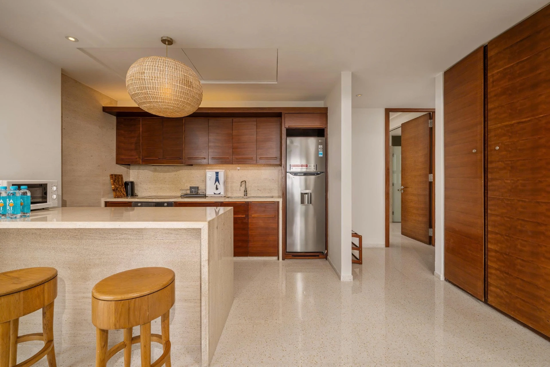 Enjoy home-cooked meals in this stylish kitchen equipped with full amenities: fridge, stove, microwave, water purifier, and dining bar.