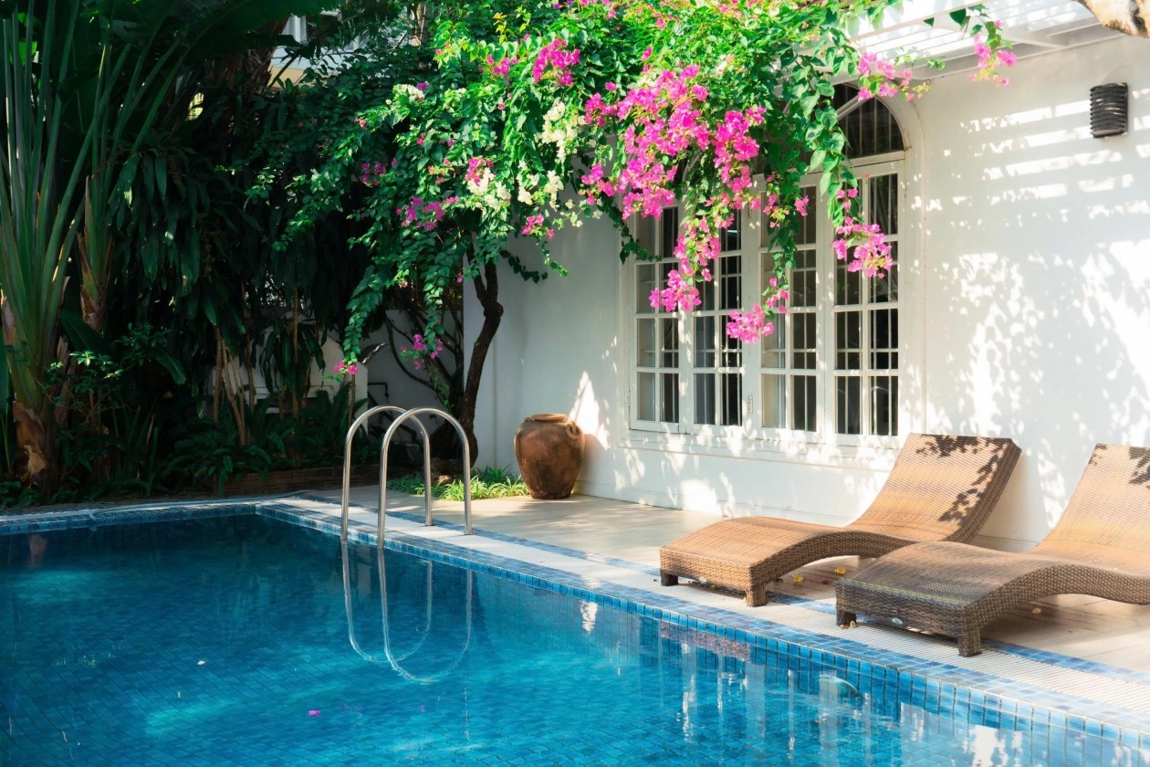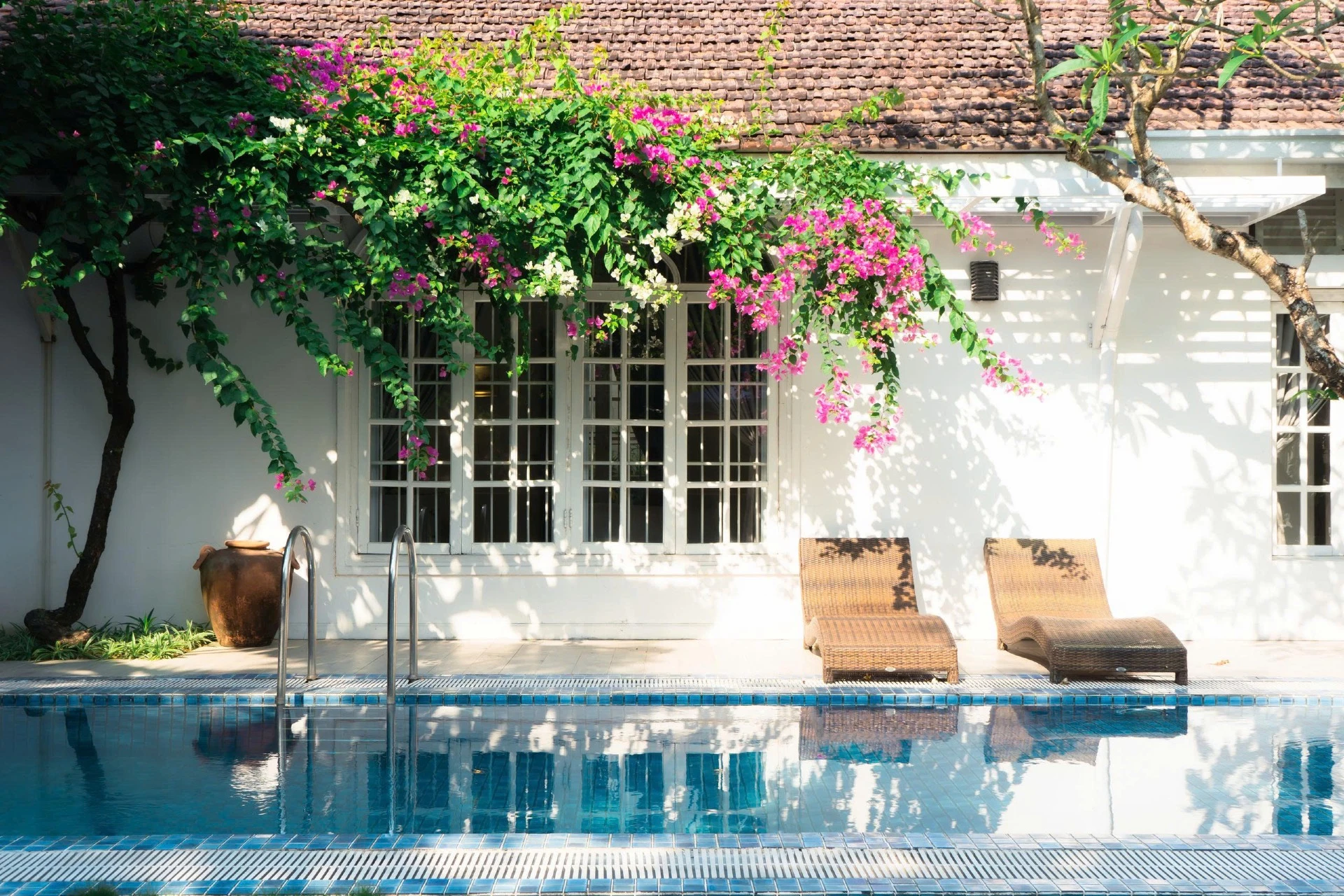 Relax by your private pool surrounded by lush greenery and blooming bougainvillea. Enjoy sun-filled mornings on the rattan loungers and peaceful after