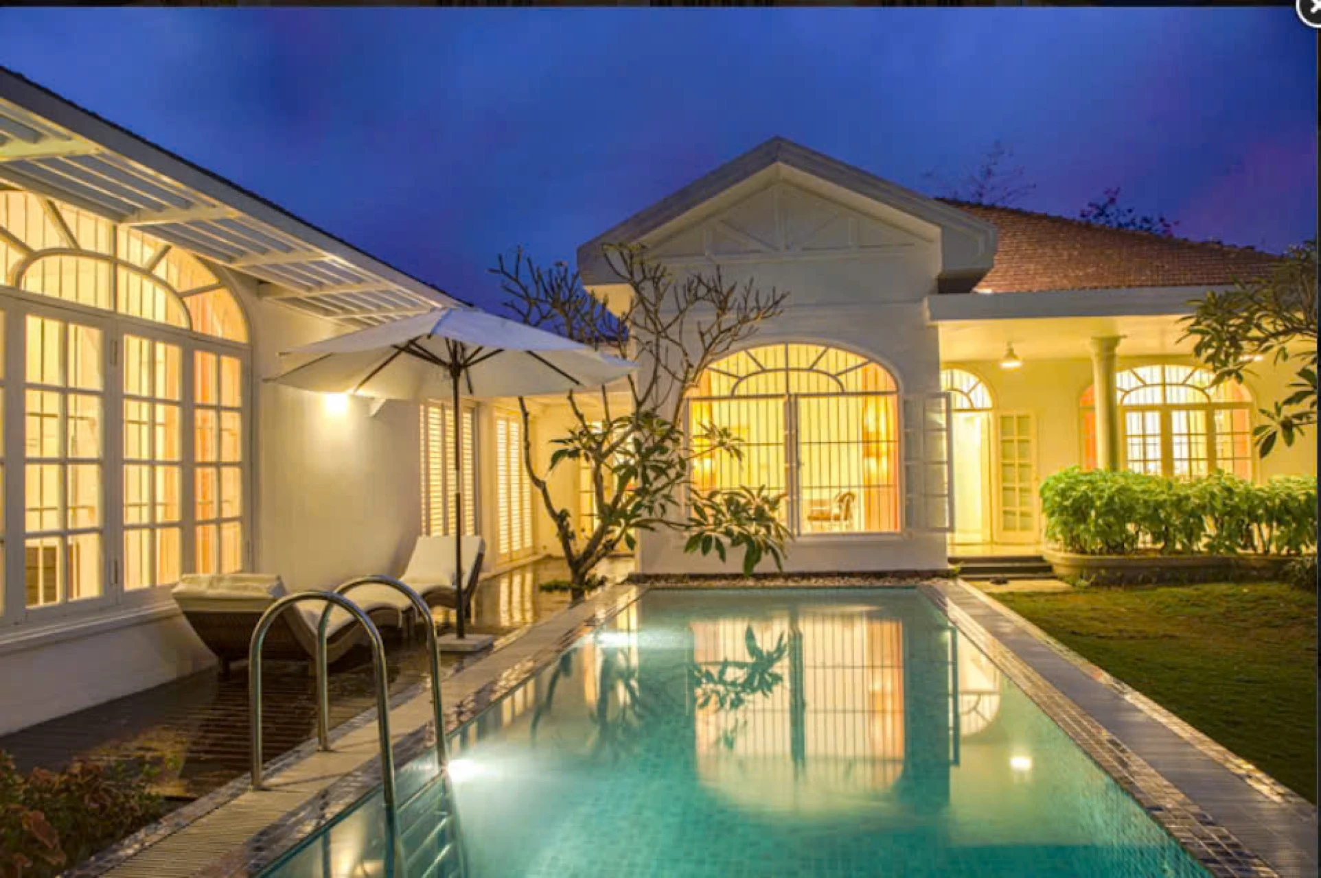 Experience warm evenings by your private pool, framed by glowing colonial-style windows and tropical trees.