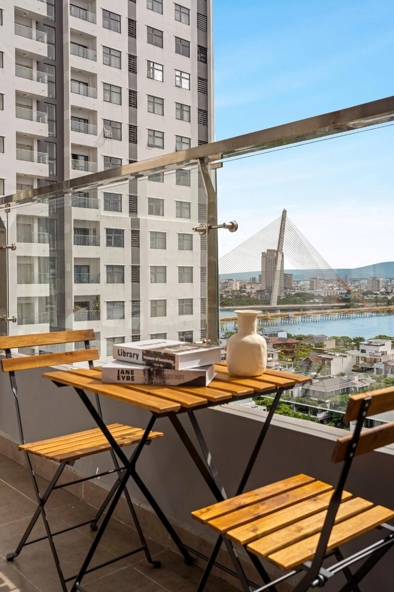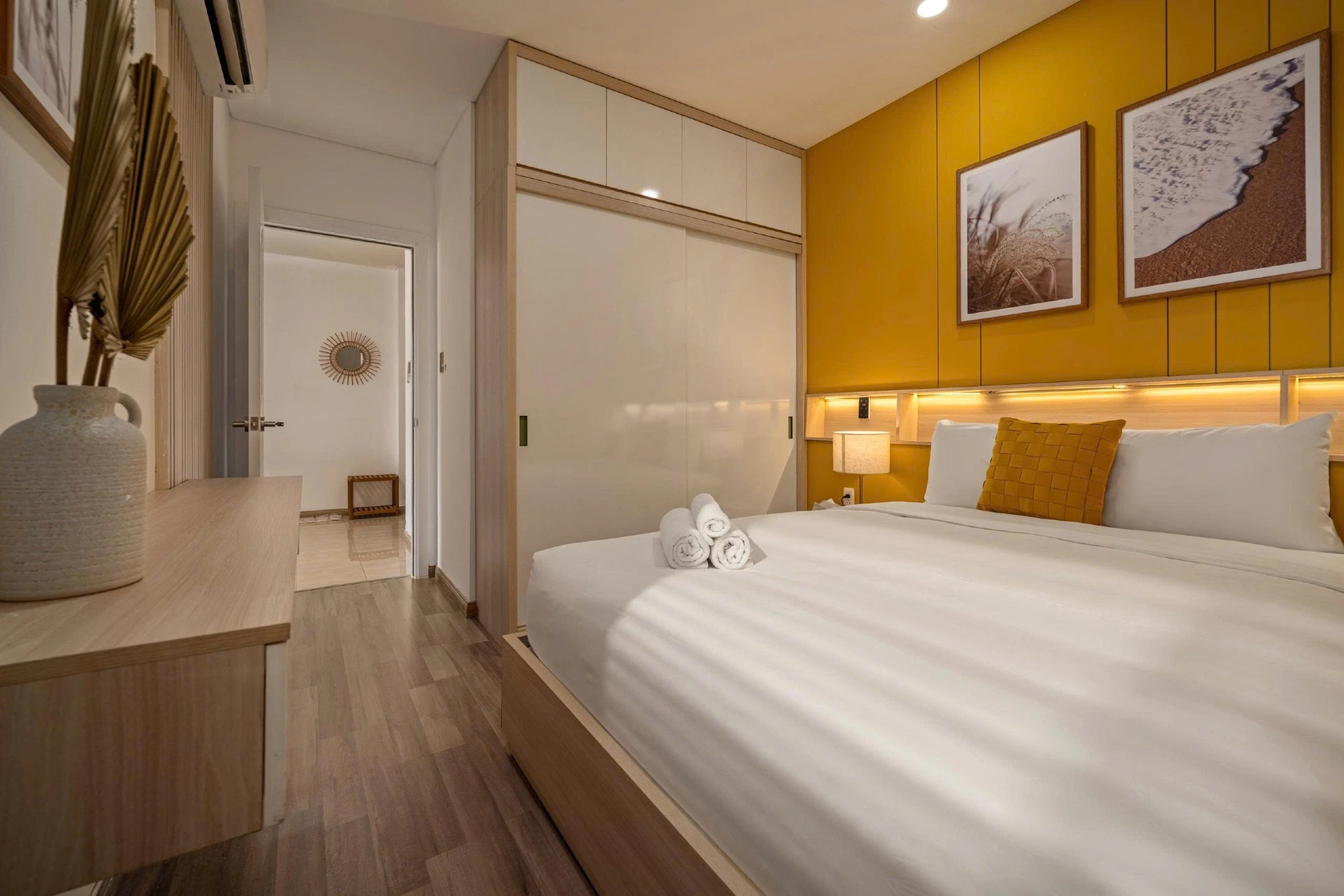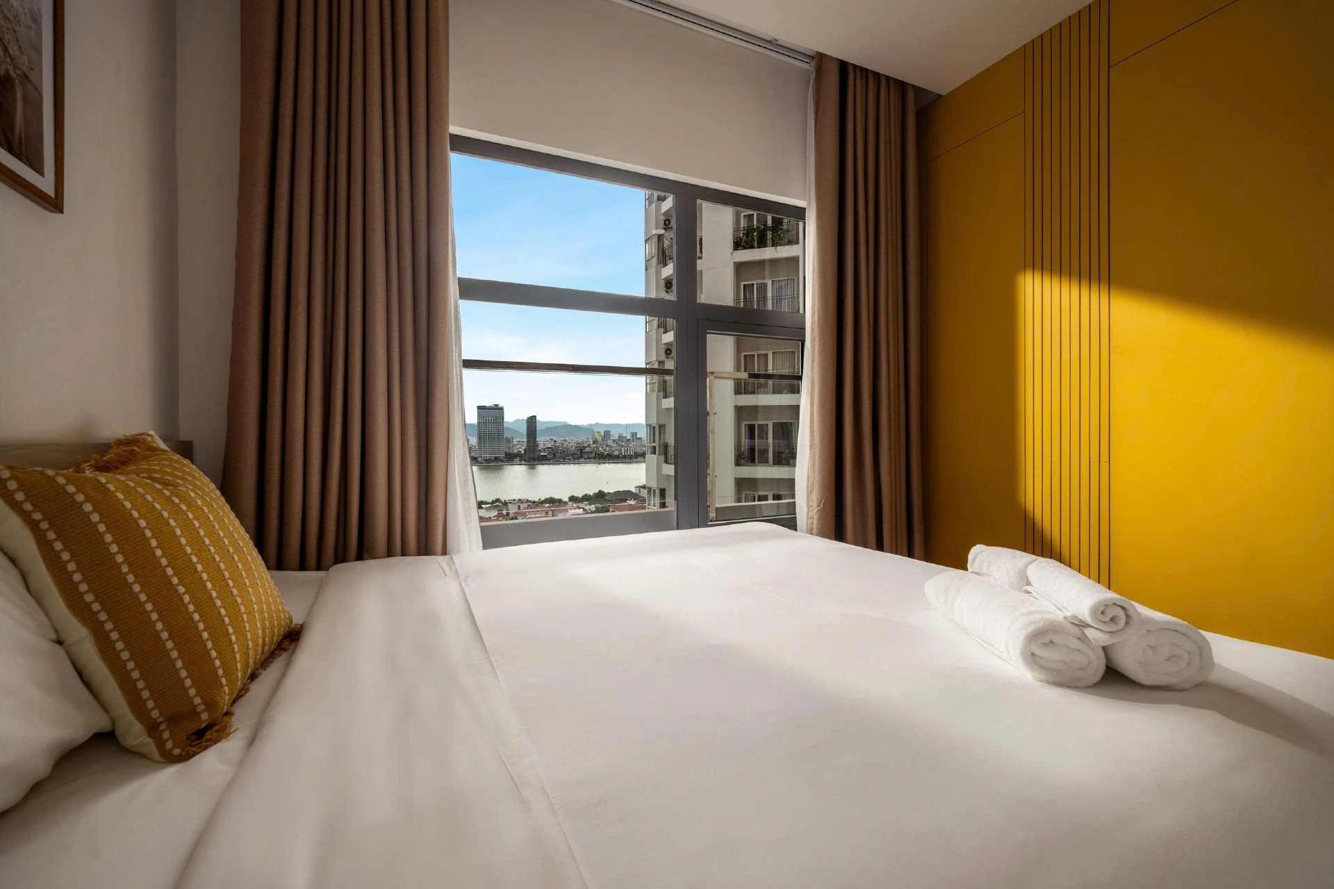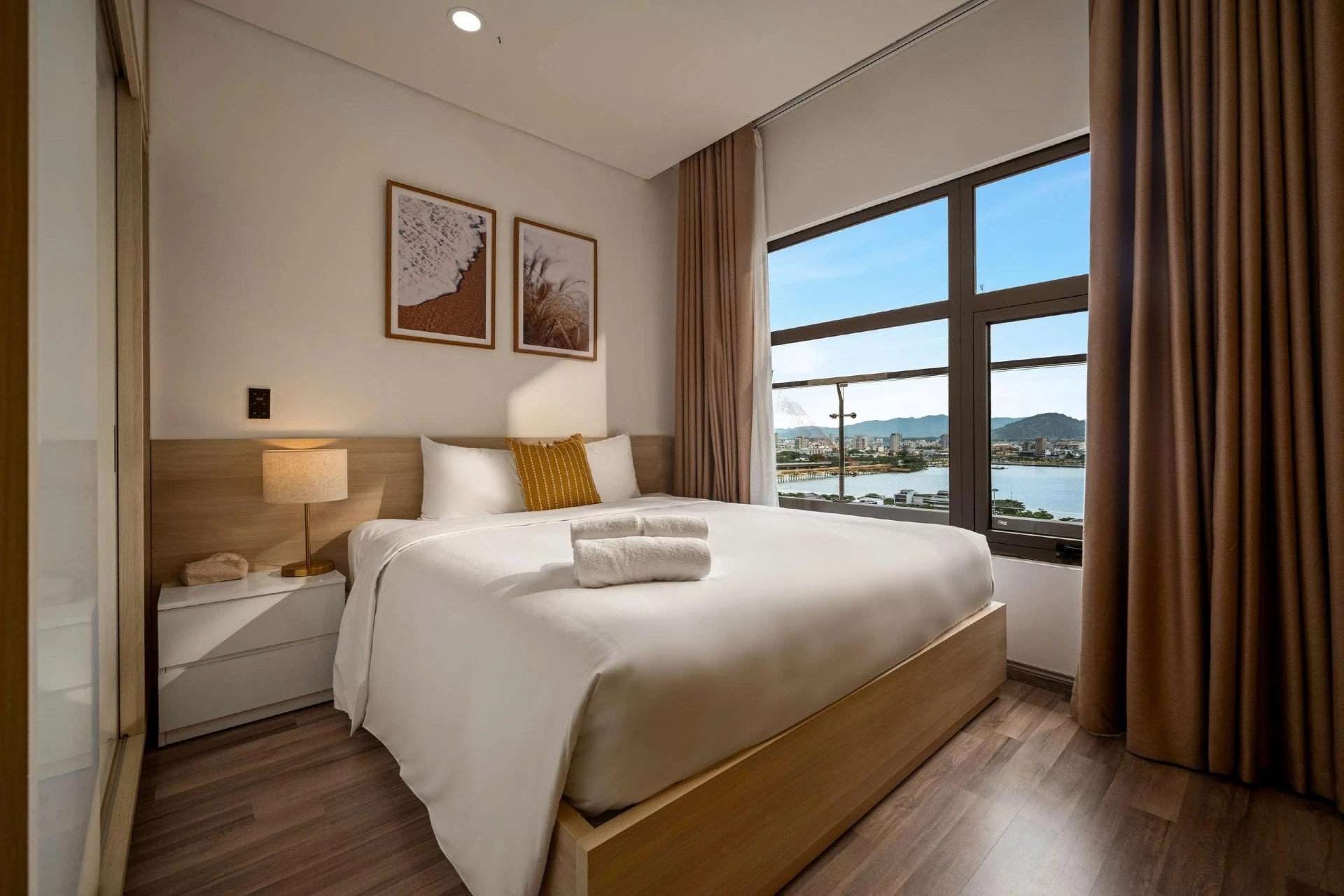 Located on the 15th floor of Monarchy, this 80m² apt offers sweeping views of Da Nang’s skyline and Tran Thi Ly Bridge. Styled with golden accents, natural wood, and woven textures, it’s a cheerful, uplifting retreat for extended stays. Cook in the fully equipped kitchen, do laundry in-unit, and unwind at the pool after a day of work or riverside walks. With cafés, marts, and markets steps away, this residence blends convenience and long-stay comfort.