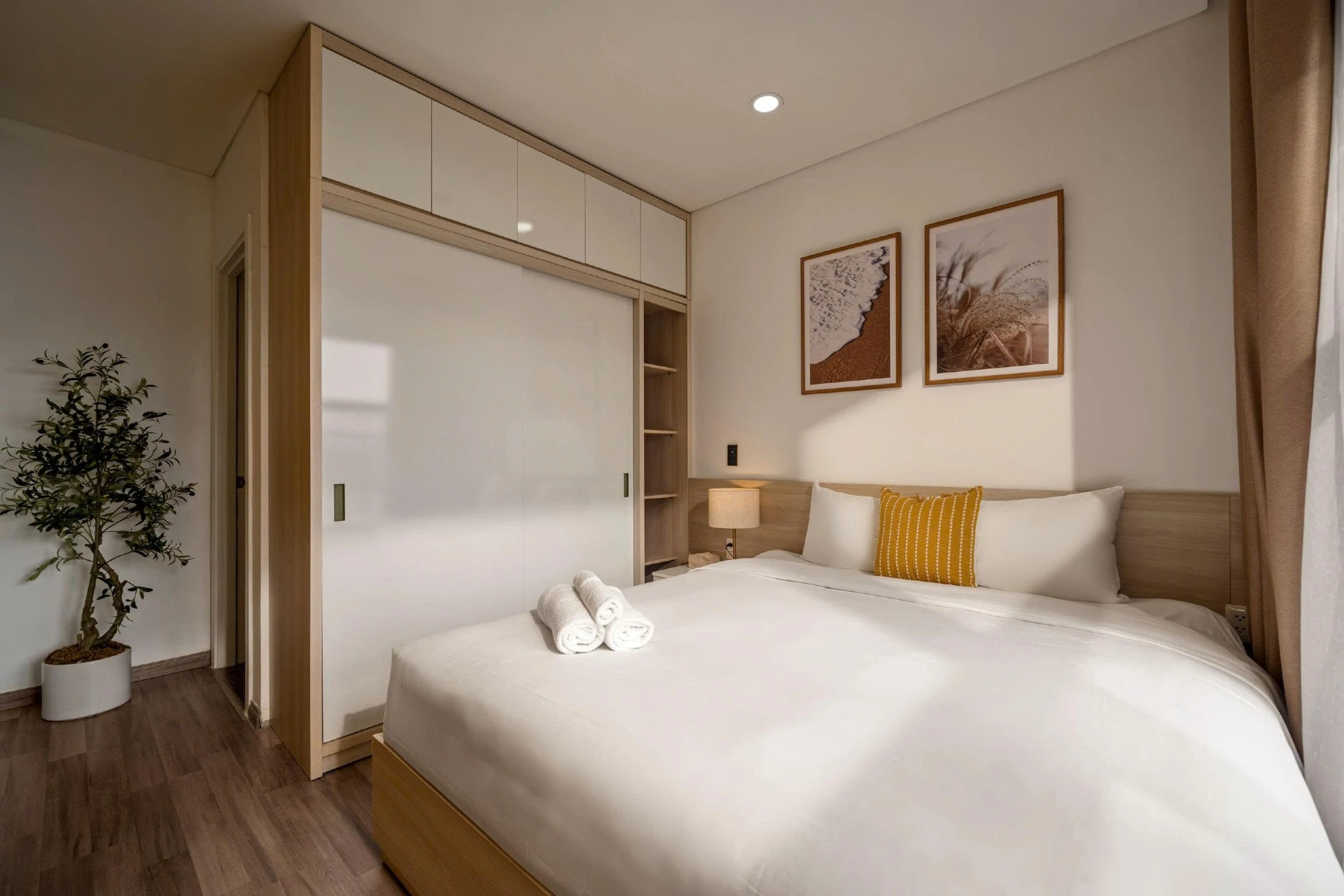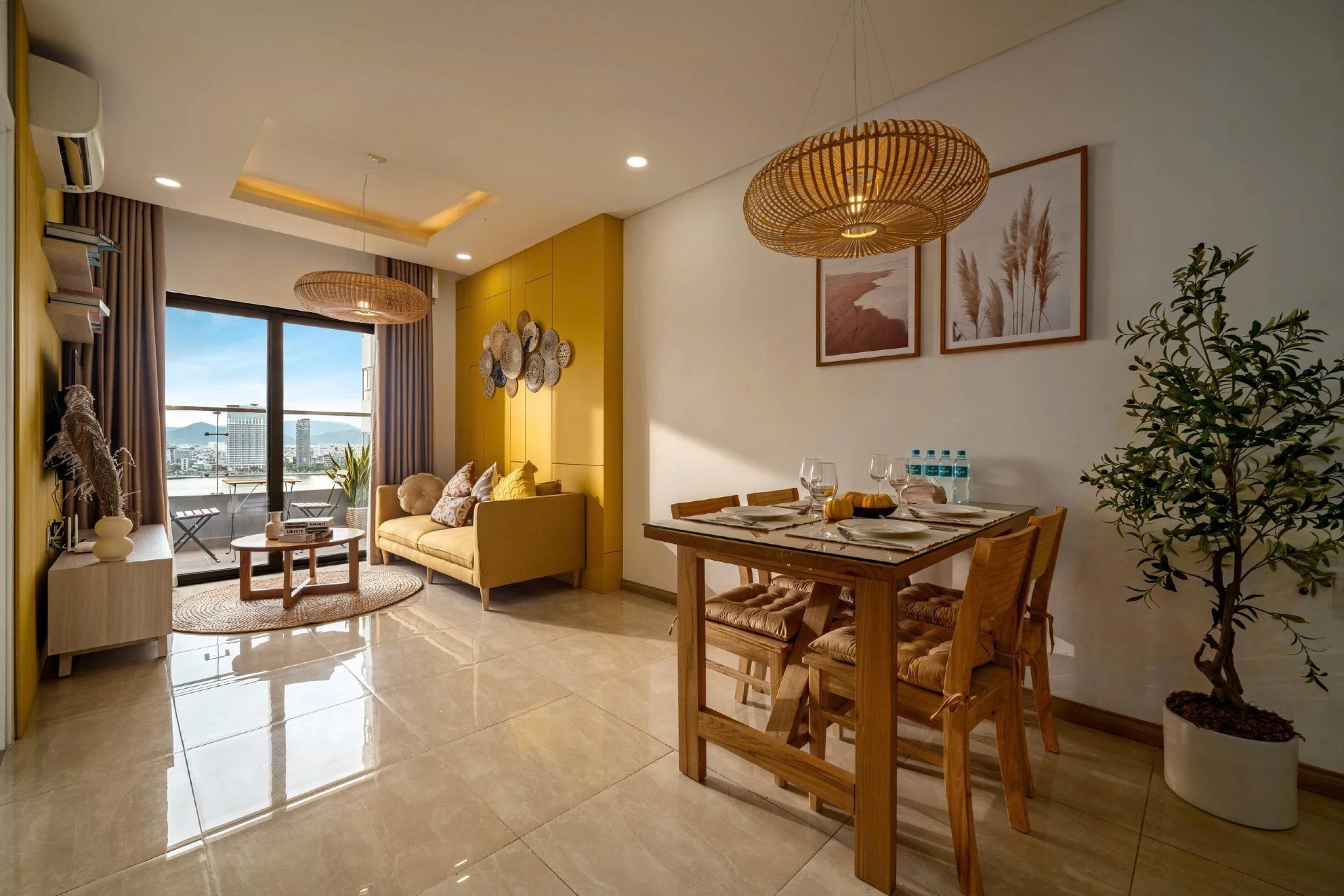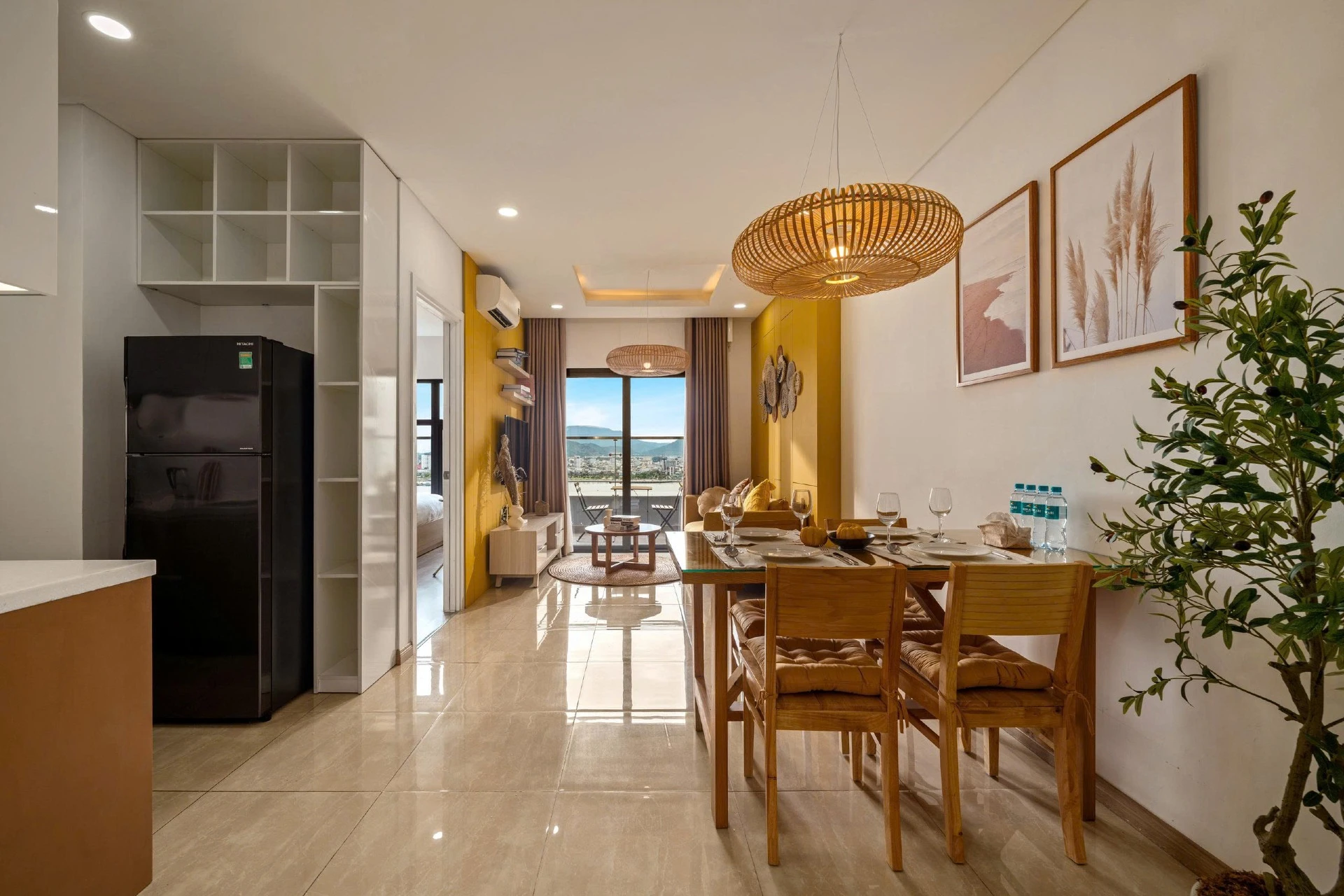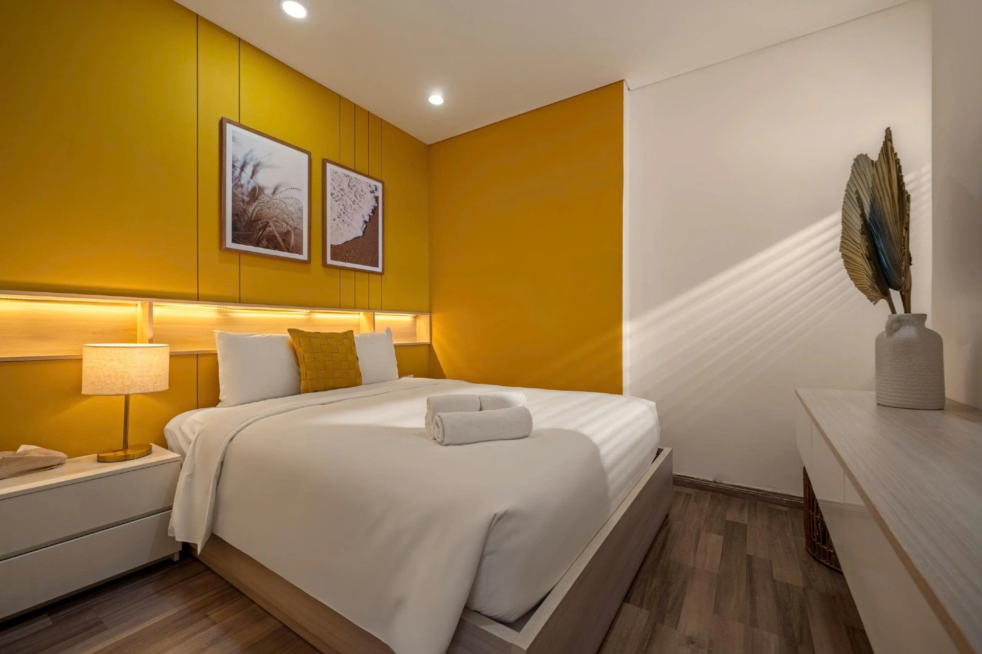 Located on the 15th floor of Monarchy, this 80m² apt offers sweeping views of Da Nang’s skyline and Tran Thi Ly Bridge. Styled with golden accents, natural wood, and woven textures, it’s a cheerful, uplifting retreat for extended stays. Cook in the fully equipped kitchen, do laundry in-unit, and unwind at the pool after a day of work or riverside walks. With cafés, marts, and markets steps away, this residence blends convenience and long-stay comfort.