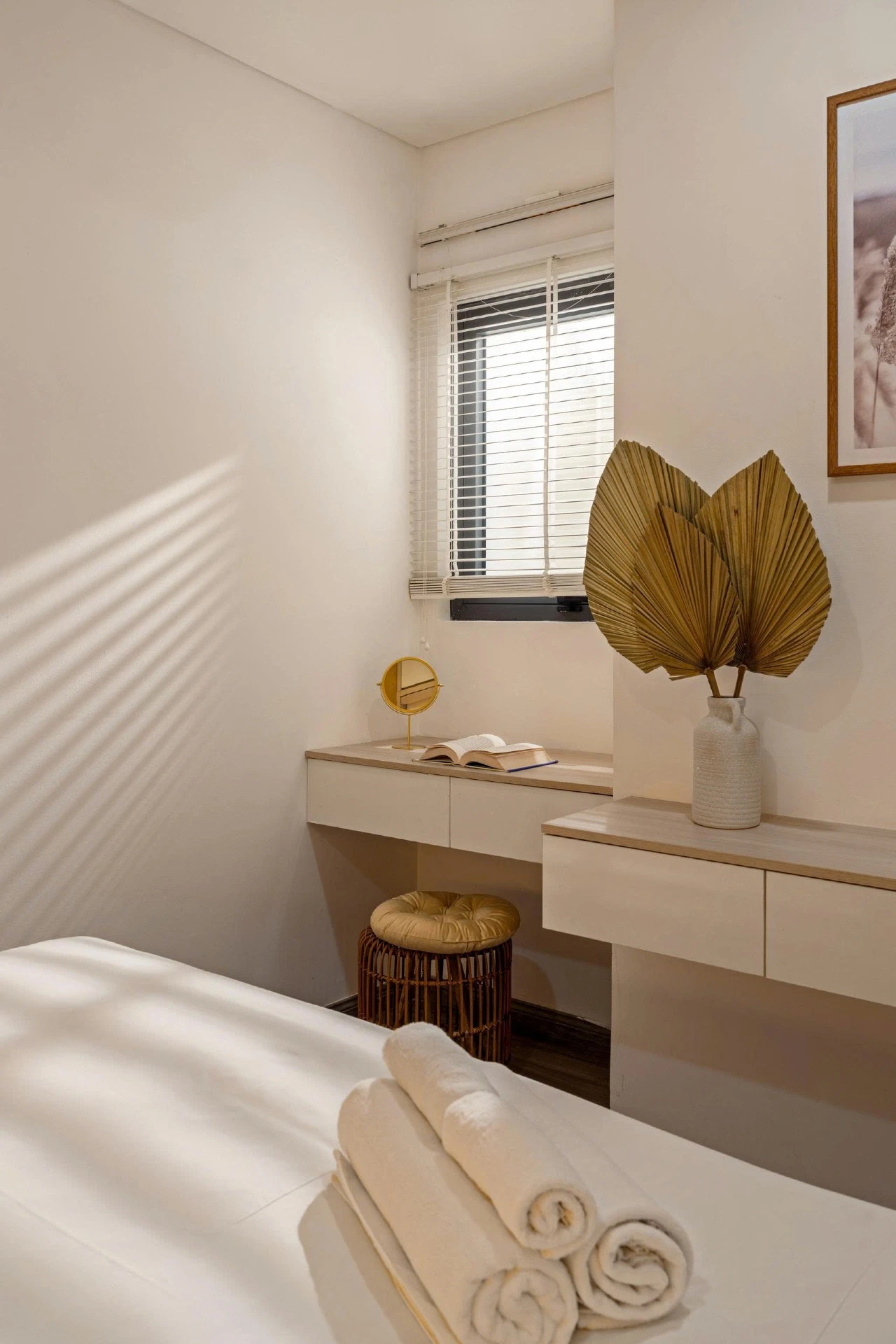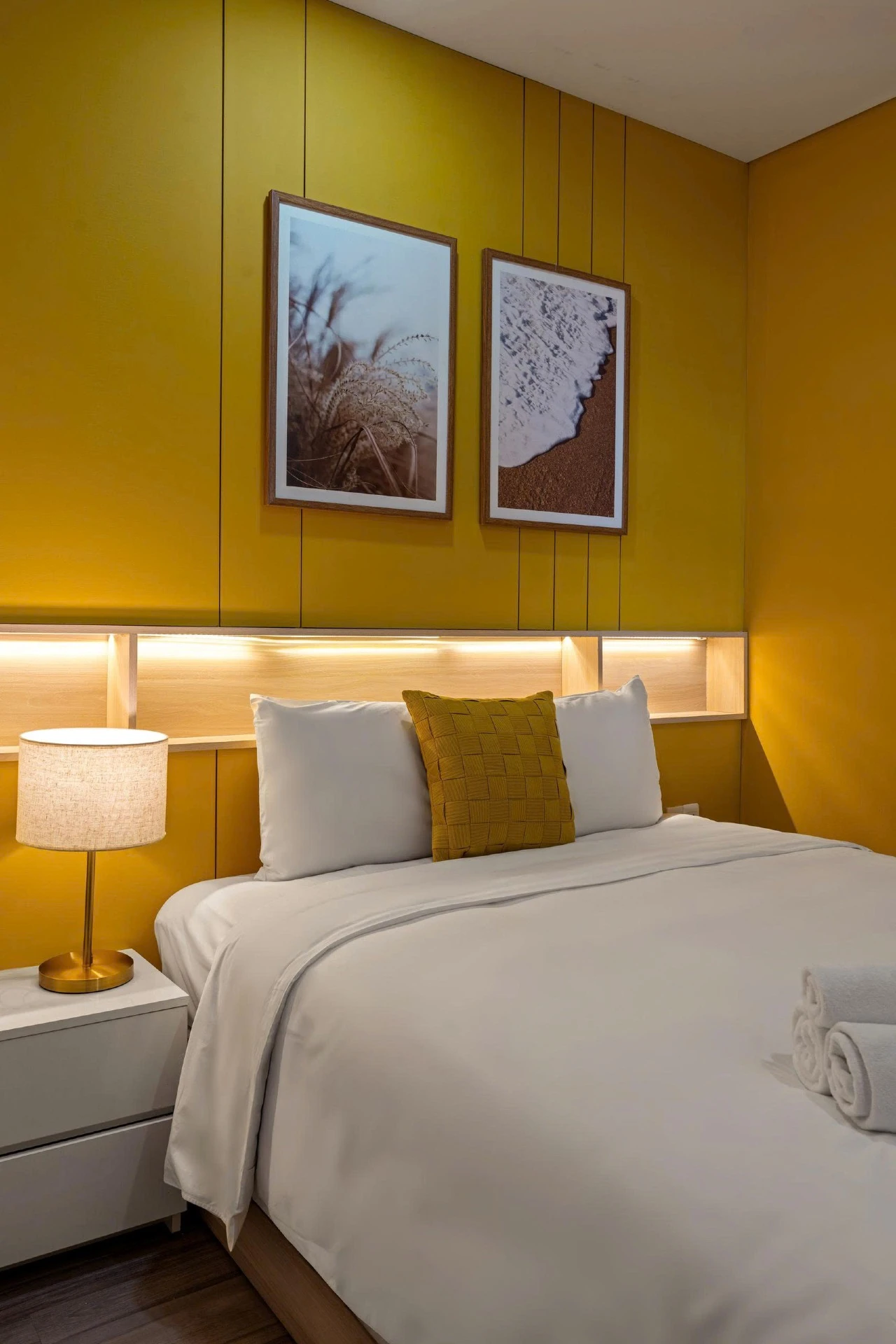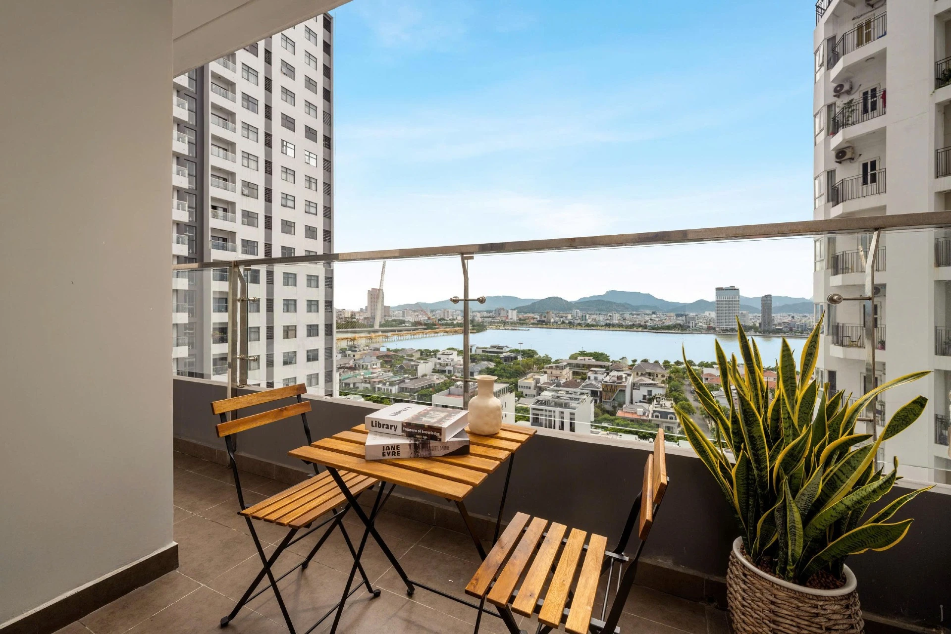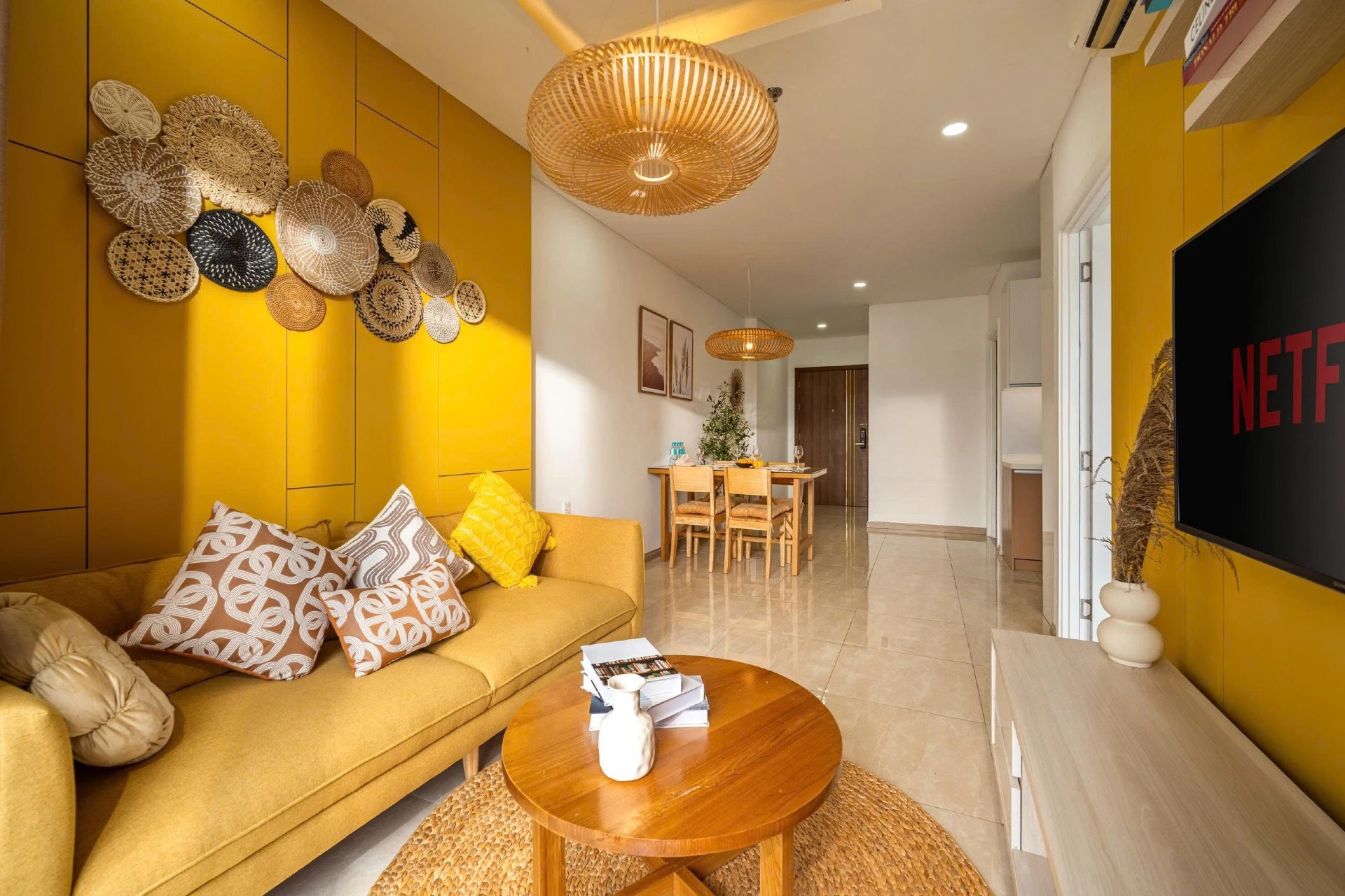 Located on the 15th floor of Monarchy, this 80m² apt offers sweeping views of Da Nang’s skyline and Tran Thi Ly Bridge. Styled with golden accents, natural wood, and woven textures, it’s a cheerful, uplifting retreat for extended stays. Cook in the fully equipped kitchen, do laundry in-unit, and unwind at the pool after a day of work or riverside walks. With cafés, marts, and markets steps away, this residence blends convenience and long-stay comfort.